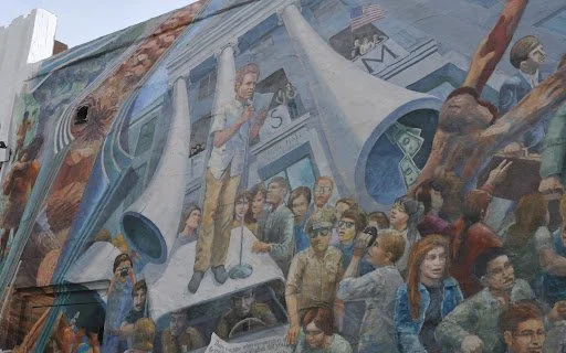 UC Berkeley’s banning of student political speech at the corner of Telegraph and Bancroft, just off the UC Berkeley campus, was a key precipitator of the Free Speech Movement. So see that for sure, and Sproul Hall Plaza, of course, and also the People’s History of the Free Speech Movement mural. Very incomplete list, it’s pretty impossible to be comprehensive here.