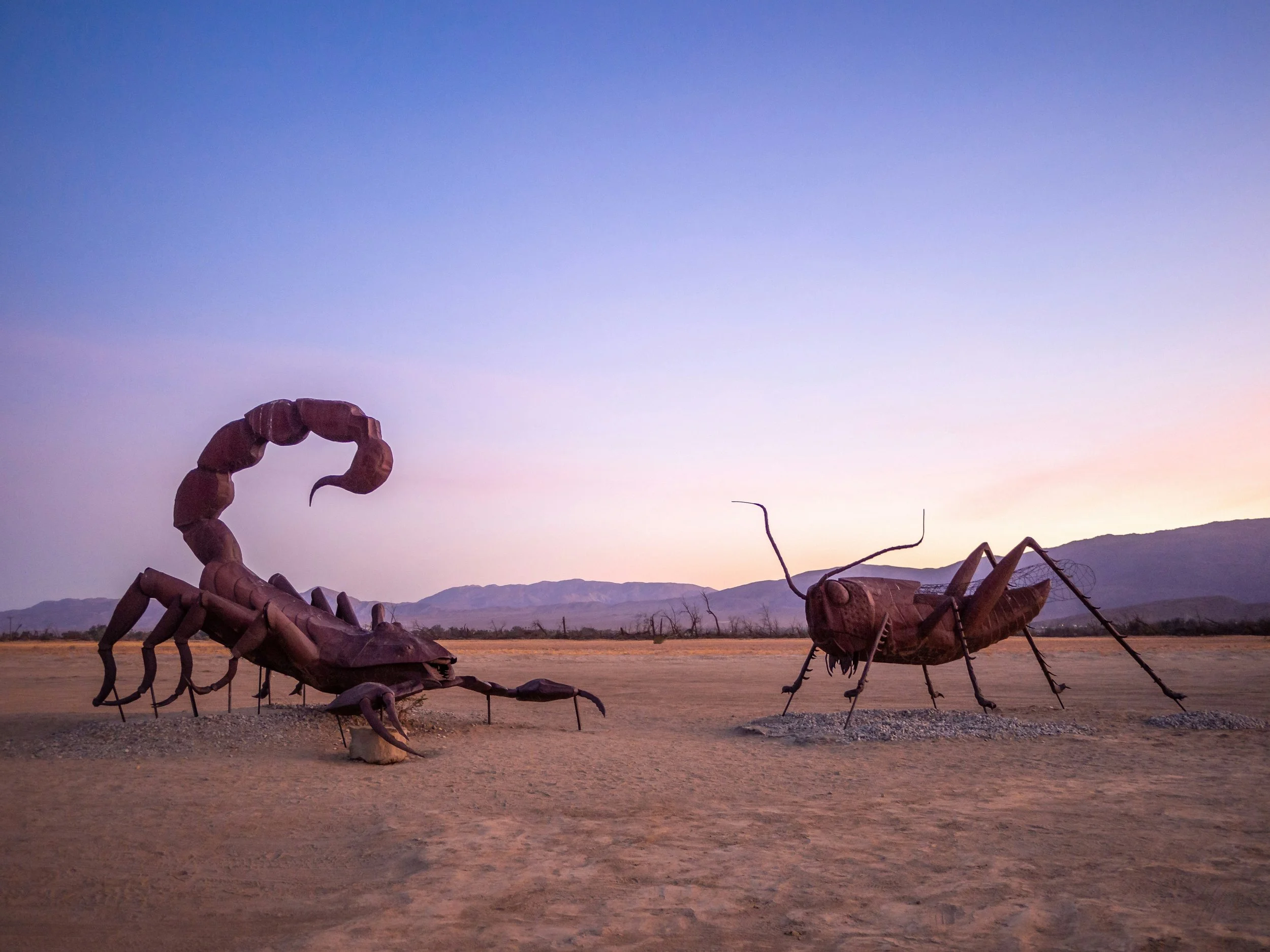 One of the most interesting things about Borrego Springs: the 130 metal sculptures at Galleta Meadow. The art is spread out over a sprawling campus of desert, and includes a strangely wonderful conglomeration of old miners, elephants, pre-historic cats, a tyrannosaurus or two, an extinct camelops, and a giant cricket (facing down a scorpion),