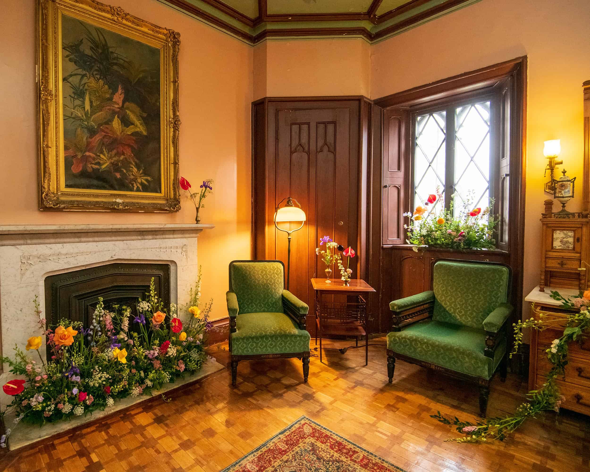 Because it’s time for Flower House, a one-weekend affair celebrating the mansion’s grand spring reopening. What takes place here is nothing short of high art: more than 20 floral designers descend on the property to transform its stained-glass chambers and alcoves and powder rooms (every room in the house, in fact) into arrestingly arranged micro-exhibits.